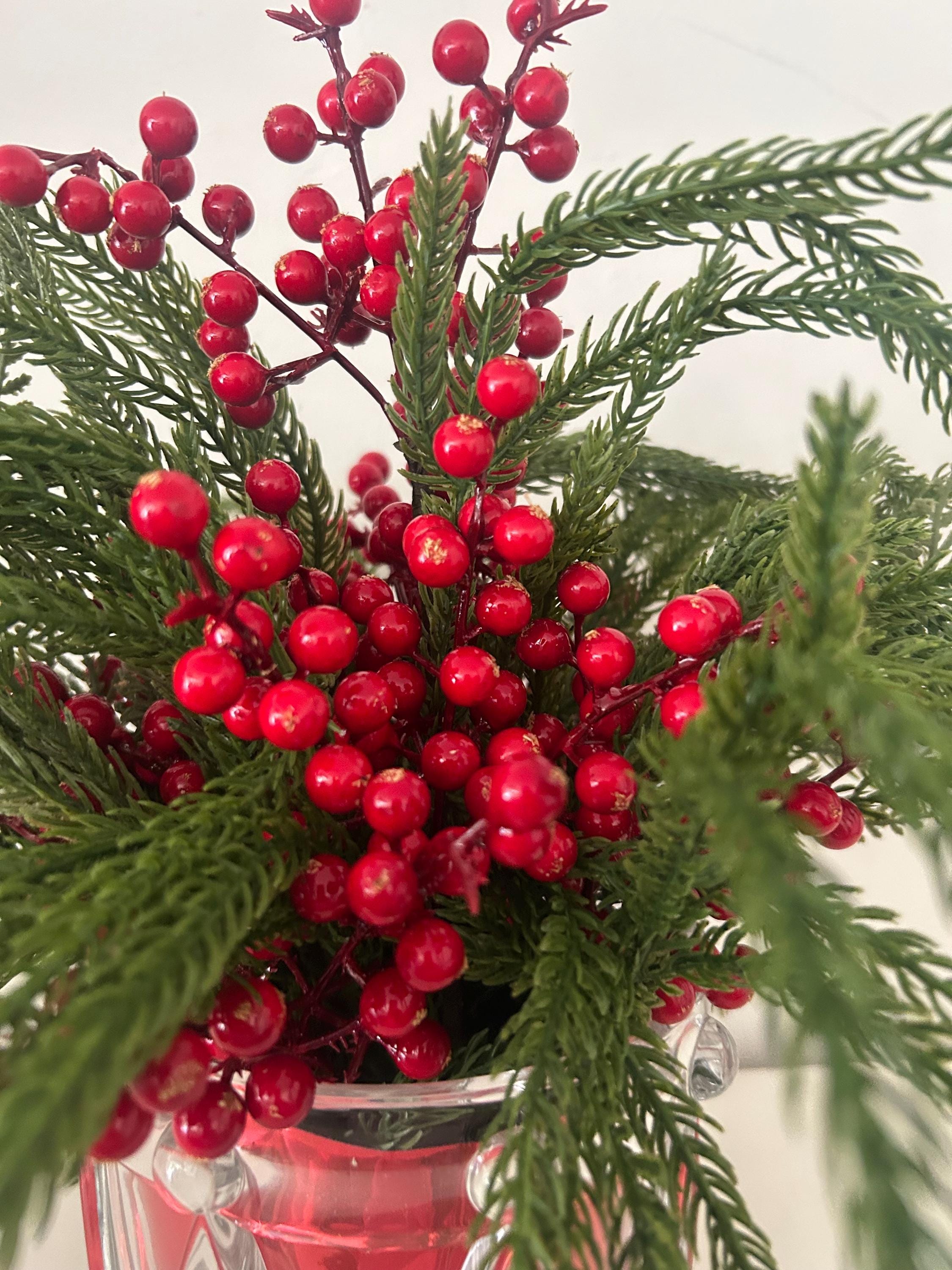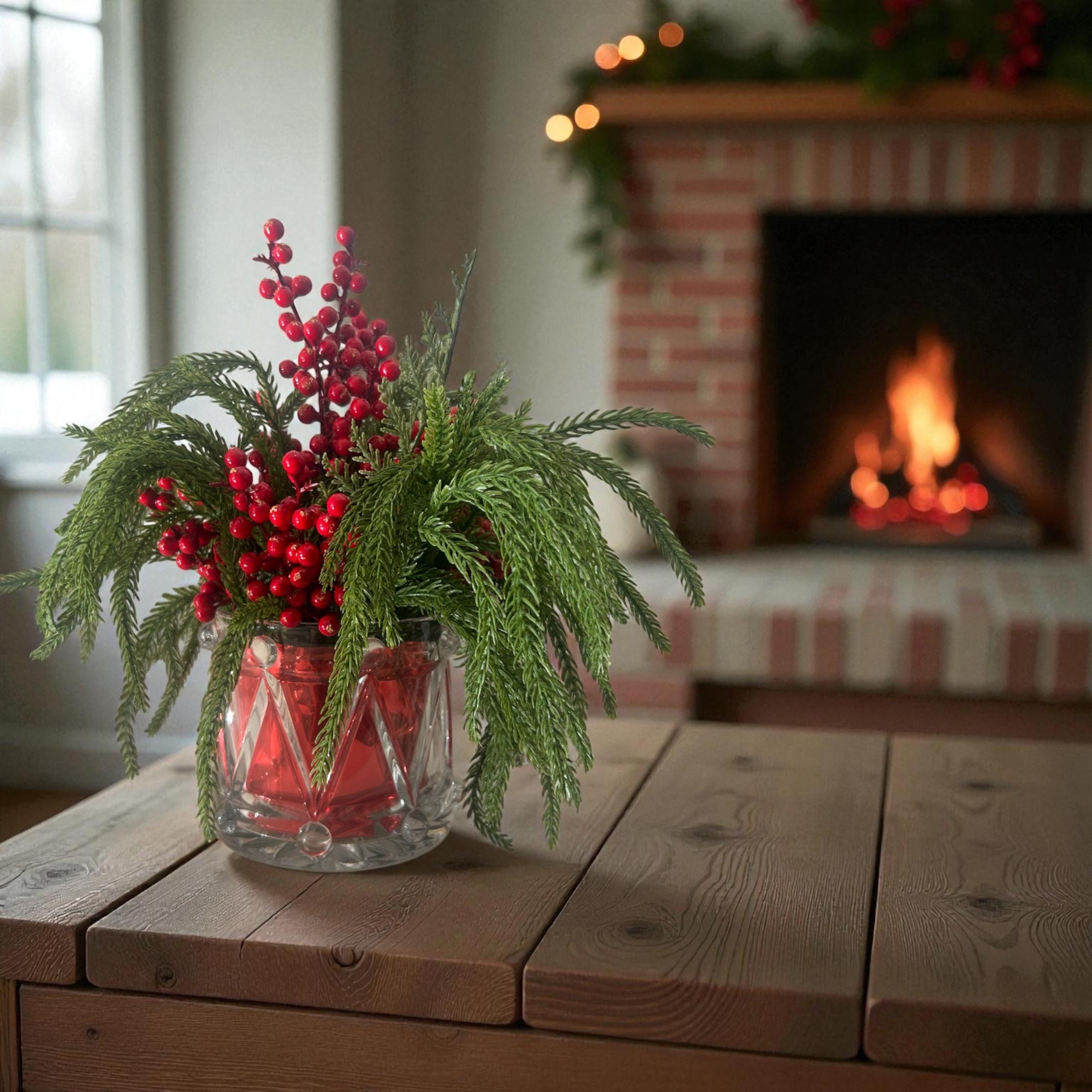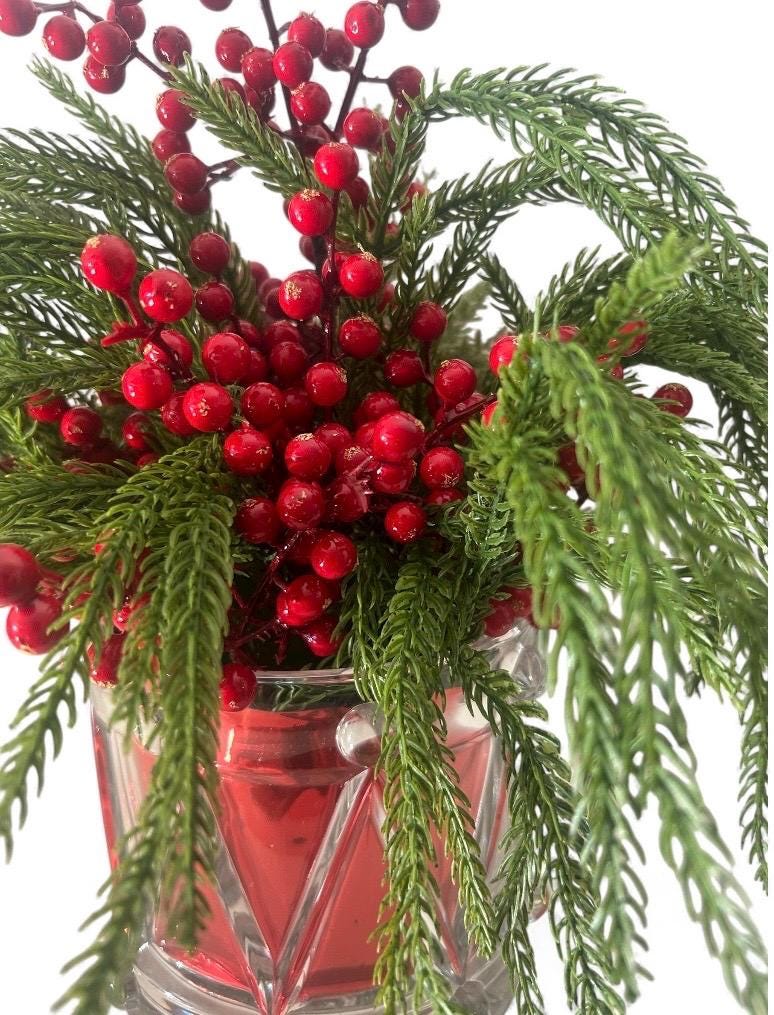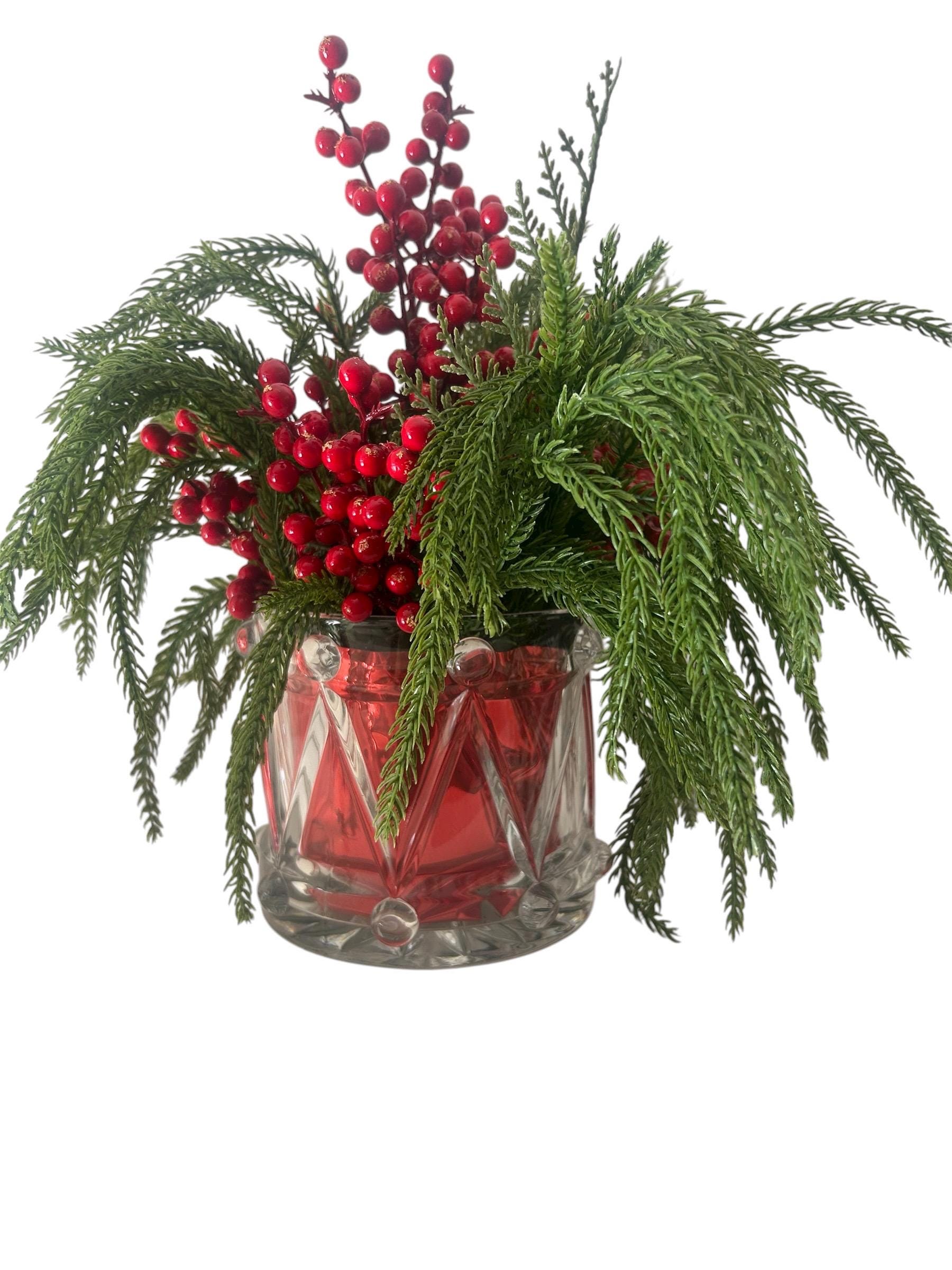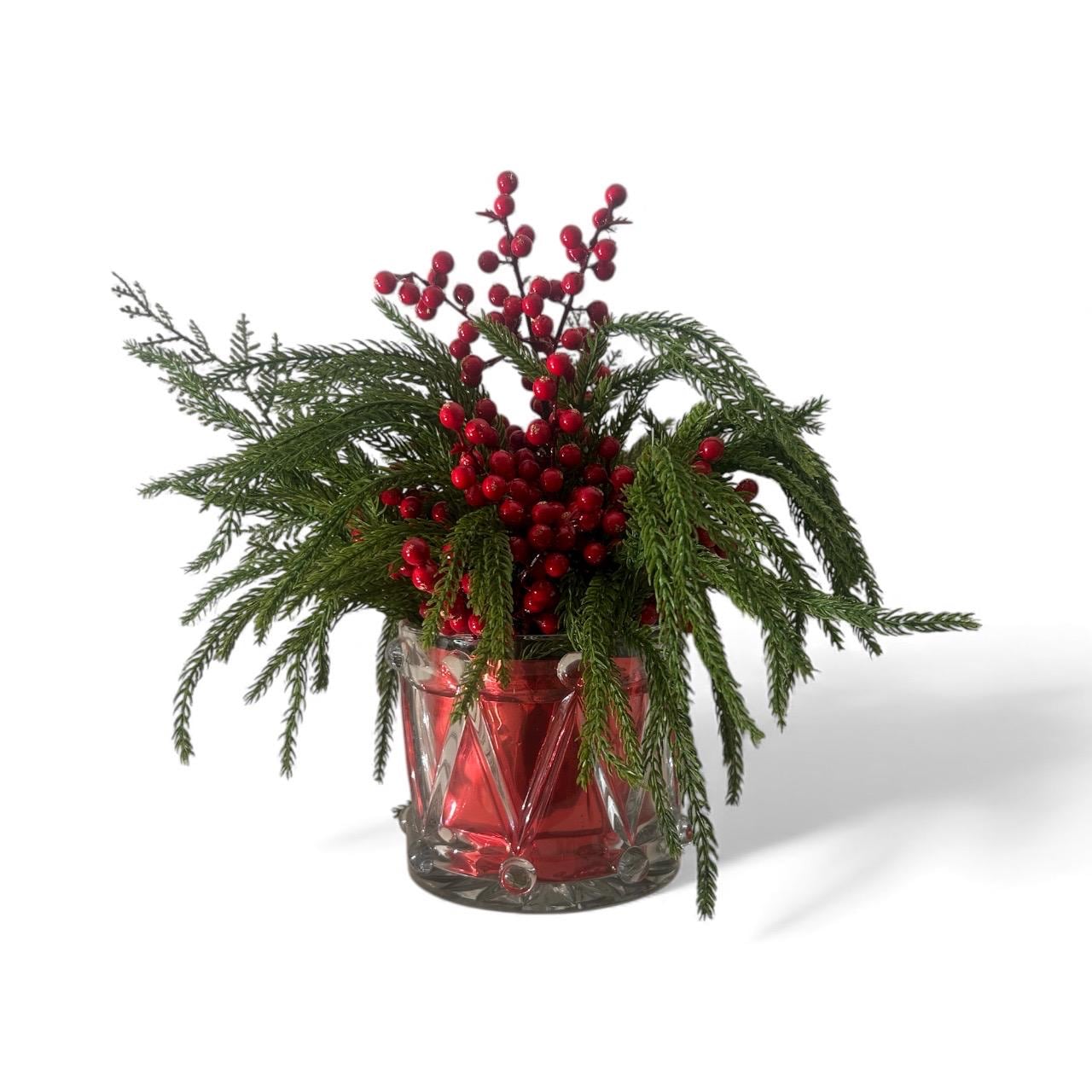 Add timeless holiday elegance to your home with this stunning Christmas arrangement. Featuring lush evergreen branches and vibrant red berries, this festive display sits in a sparkling crystal drum-style vase that catches the light beautifully.