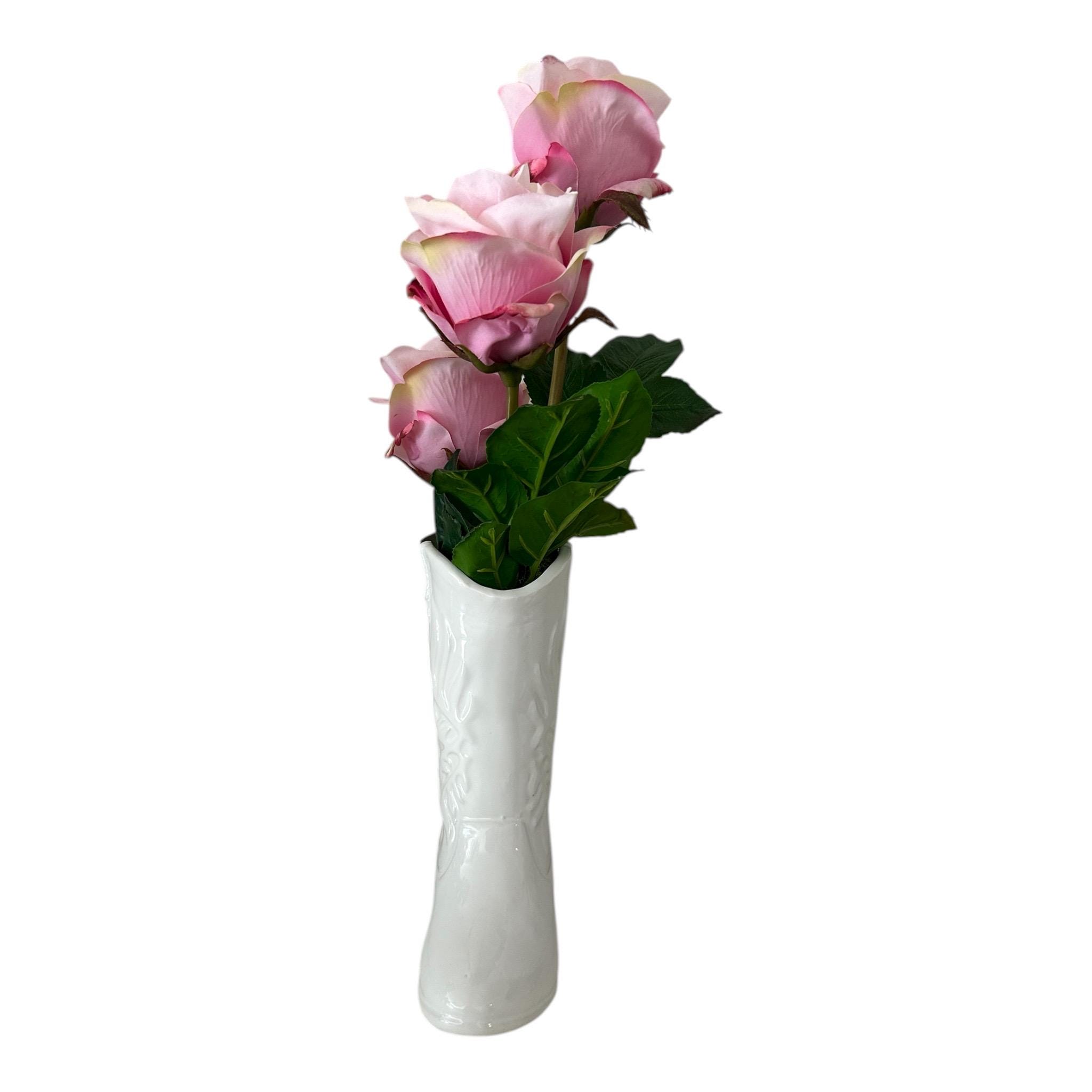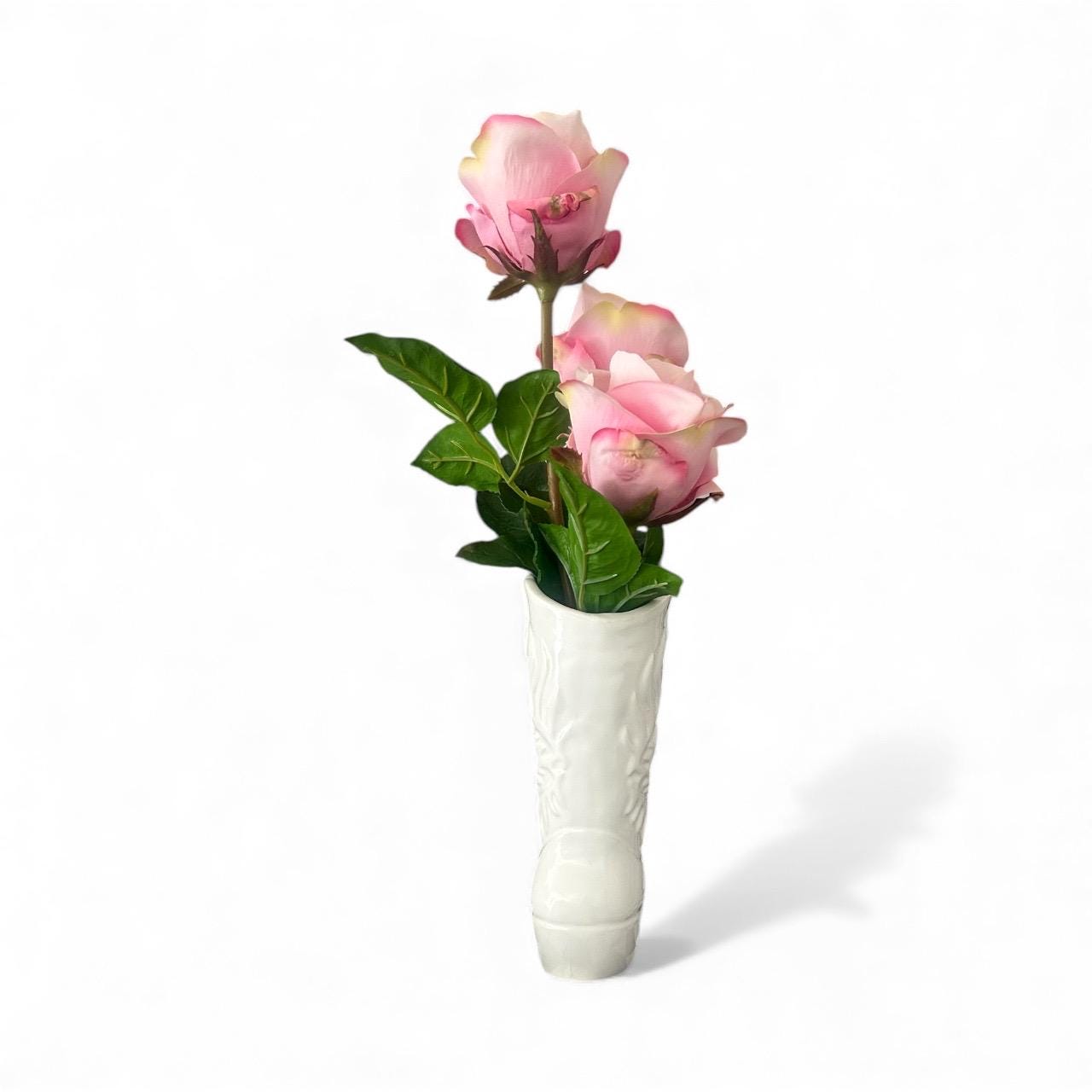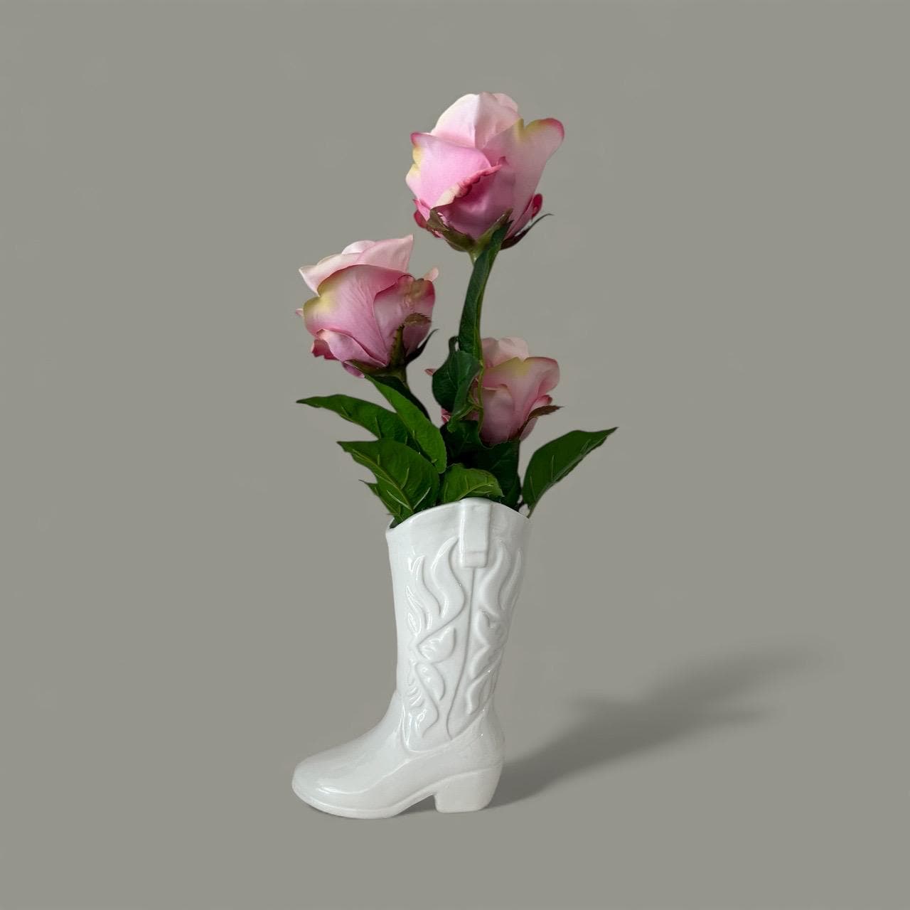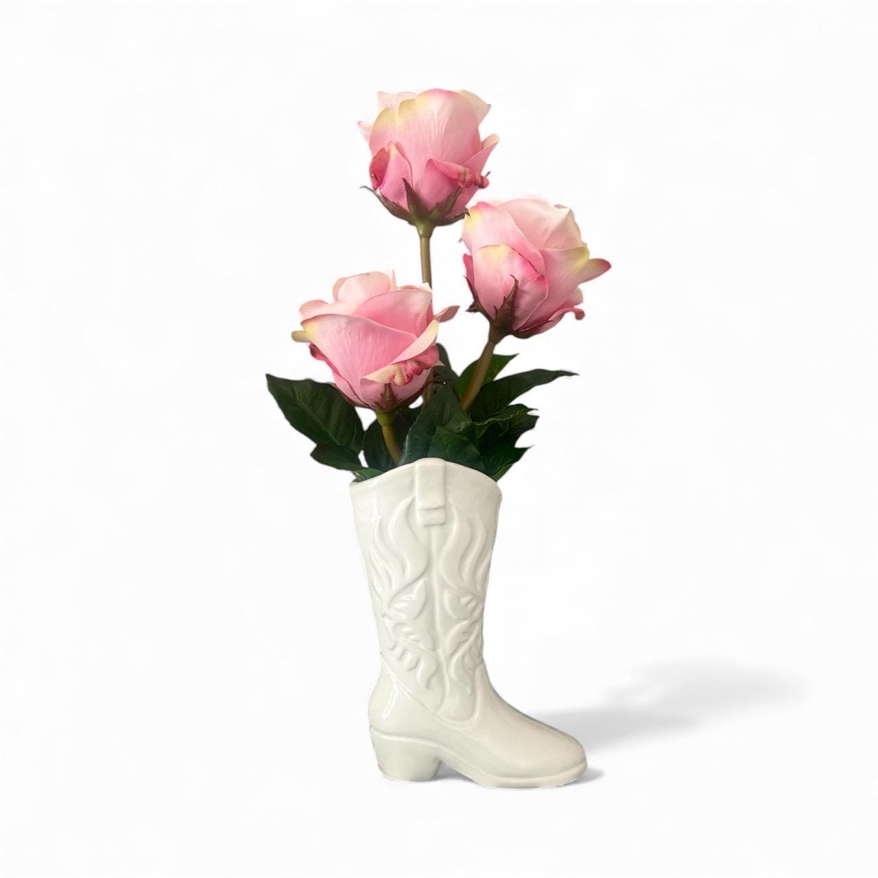 Add a touch of Western charm to your space with this white ceramic cowboy boot vase, perfect for displaying pink real touch flowers or as a unique decorative piece. Standing 17 inches tall and 8 inches wide, this stylish vase features intricate boot detailing and a glossy finish that complements any rustic, farmhouse, or modern country decor.