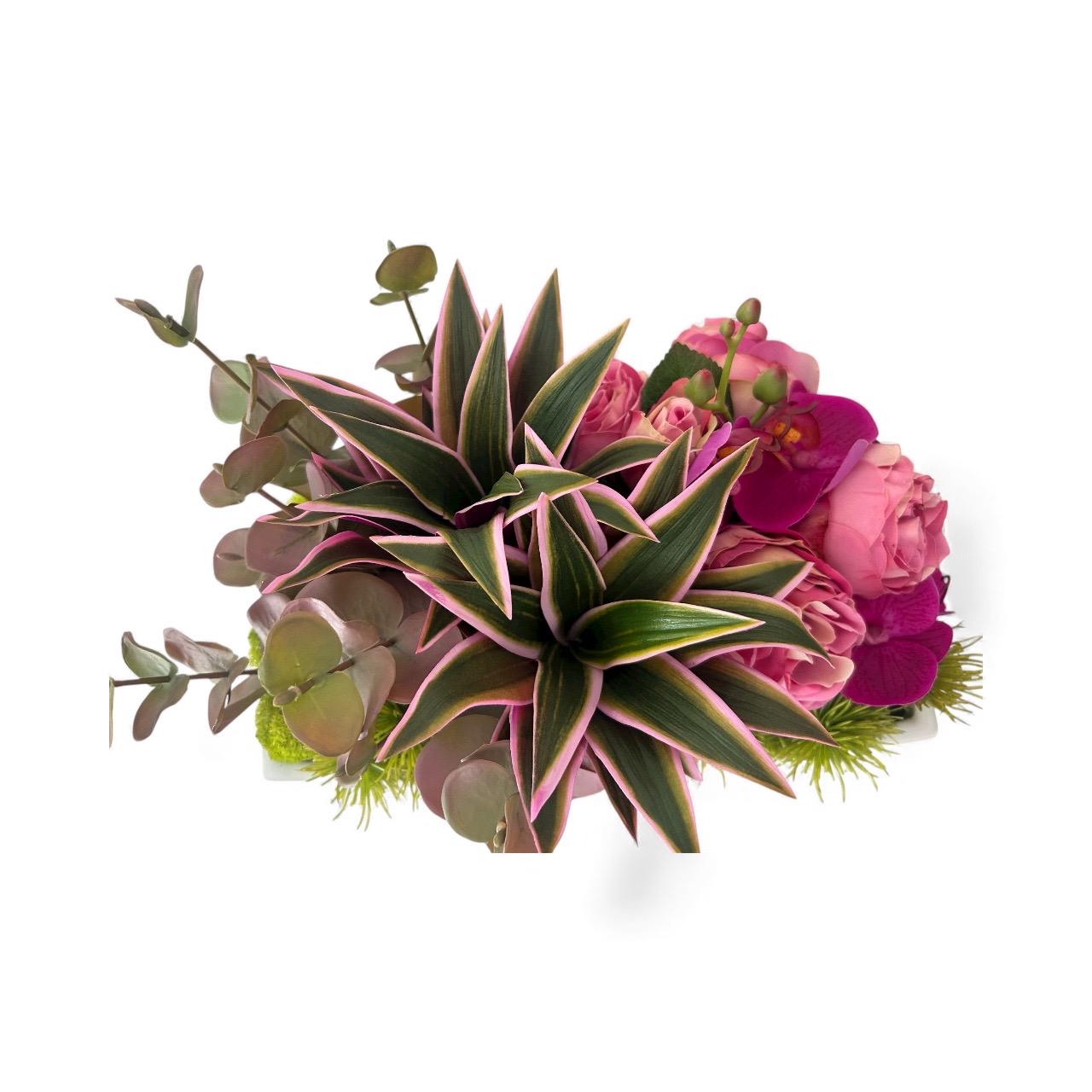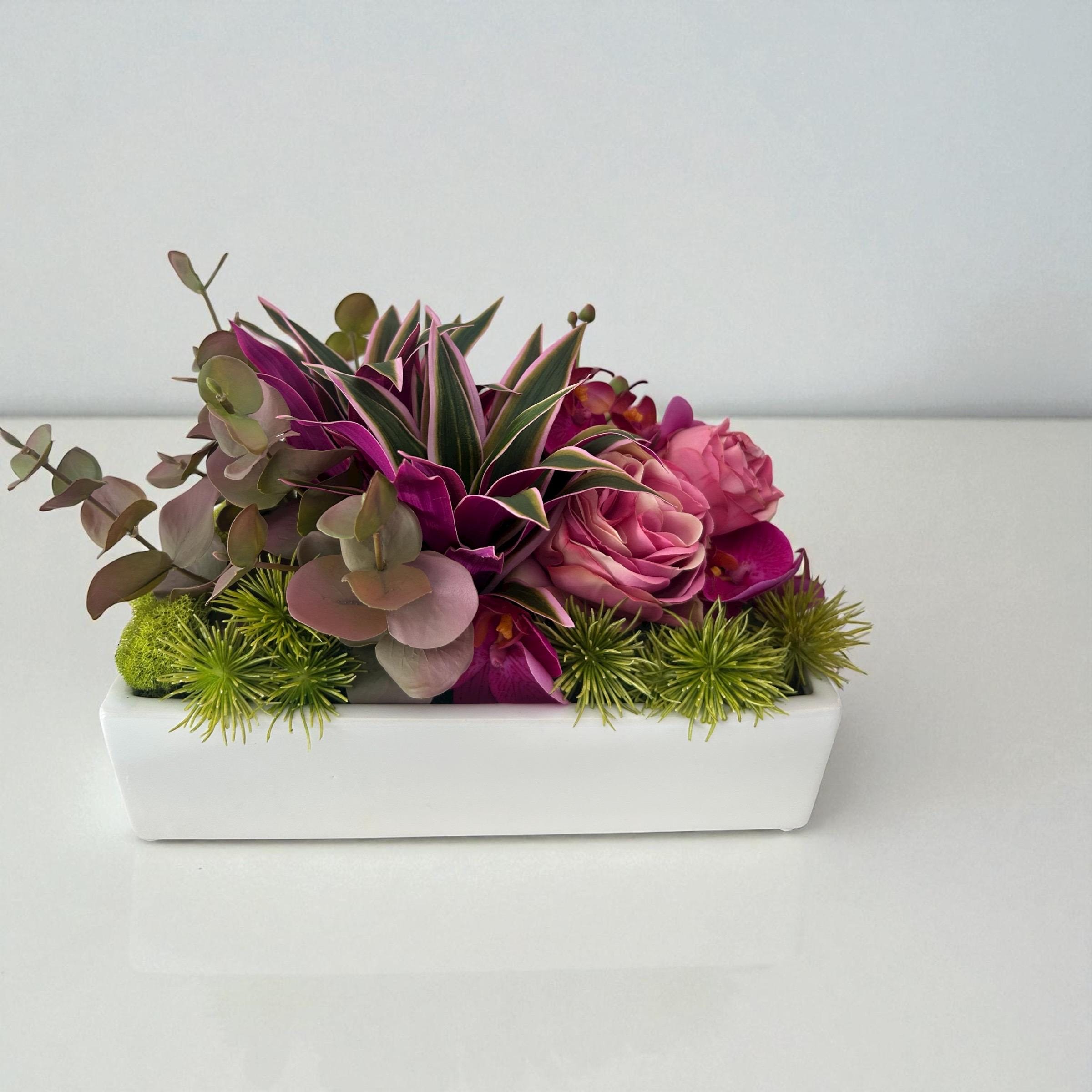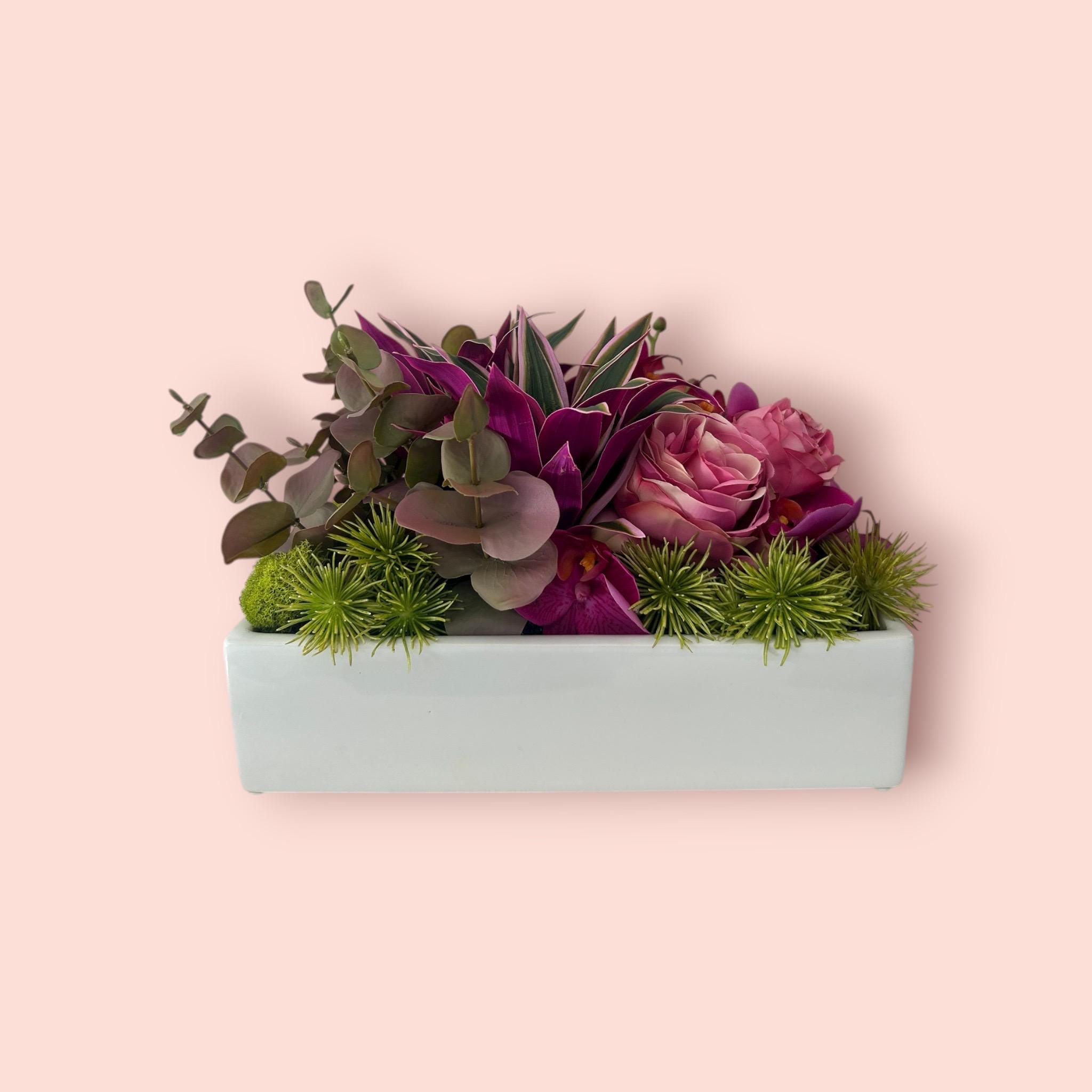 Each arrangement is thoughtfully designed in a sleek white rectangular ceramic vase, showcasing lush pink blooms, variegated foliage, and vibrant green accents for a fresh, balanced look. Perfect for brightening up your living room, office, or dining area — or as a unique gift that lasts.