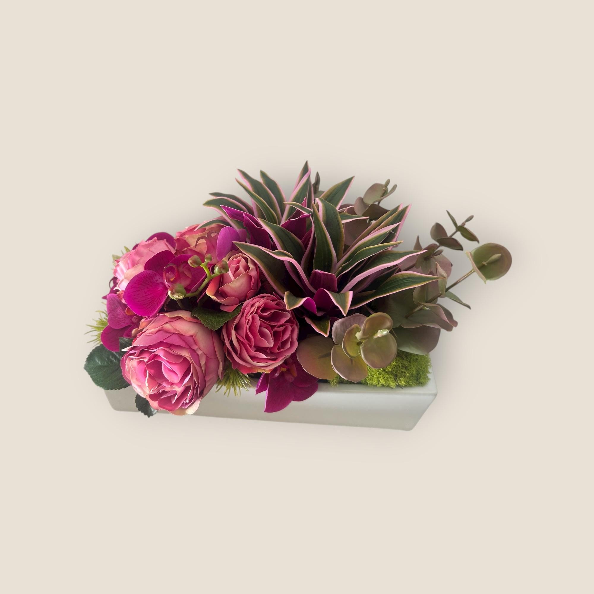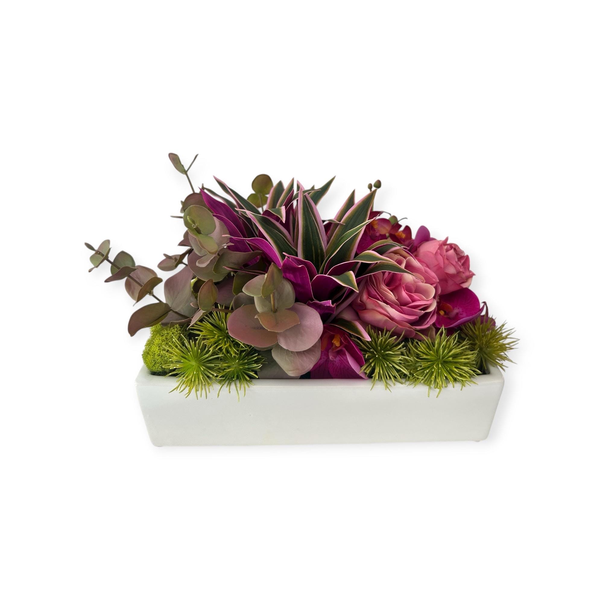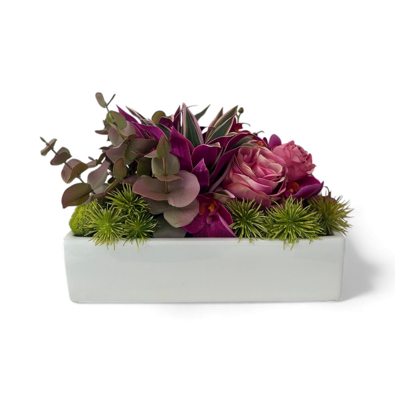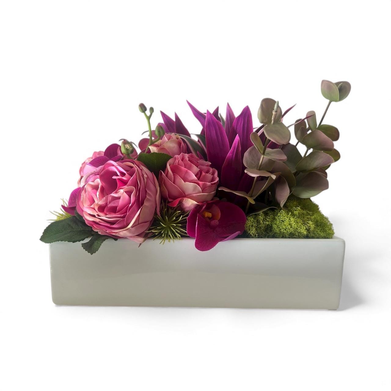 Each arrangement is thoughtfully designed in a sleek white rectangular ceramic vase, showcasing lush pink blooms, variegated foliage, and vibrant green accents for a fresh, balanced look. Perfect for brightening up your living room, office, or dining area — or as a unique gift that lasts.