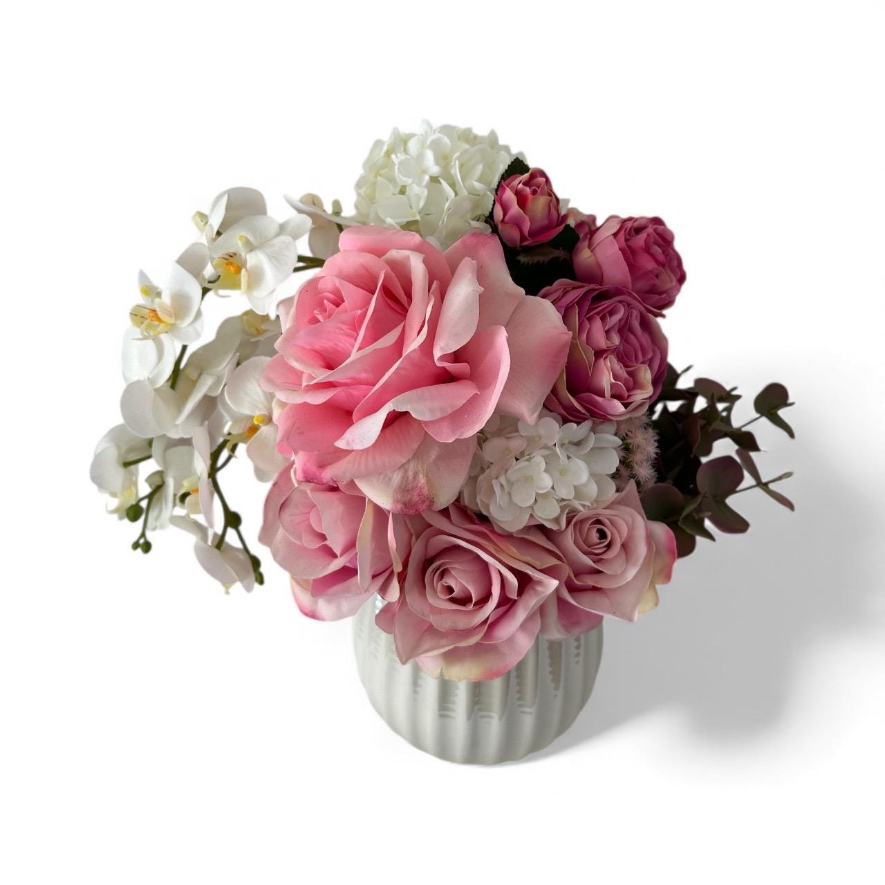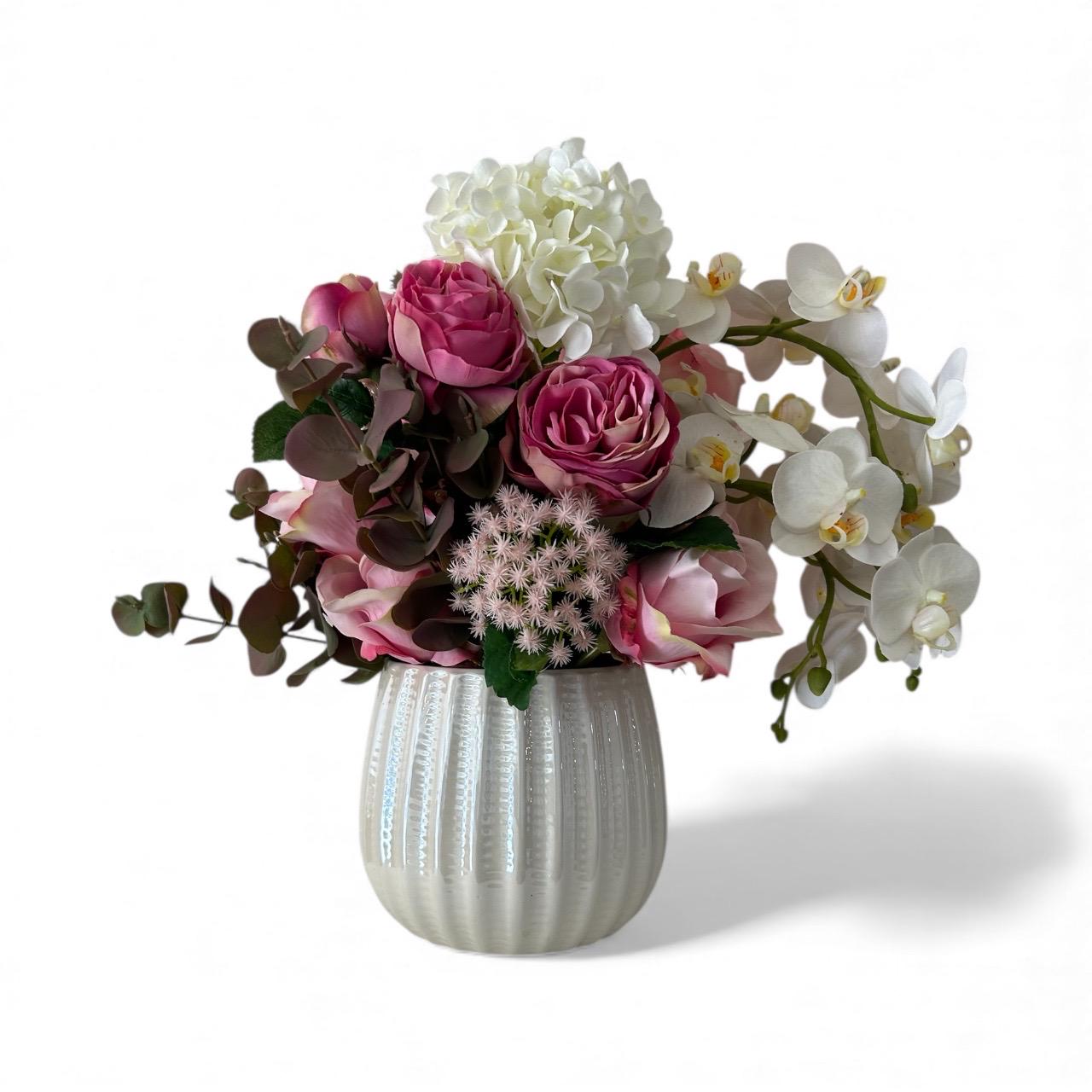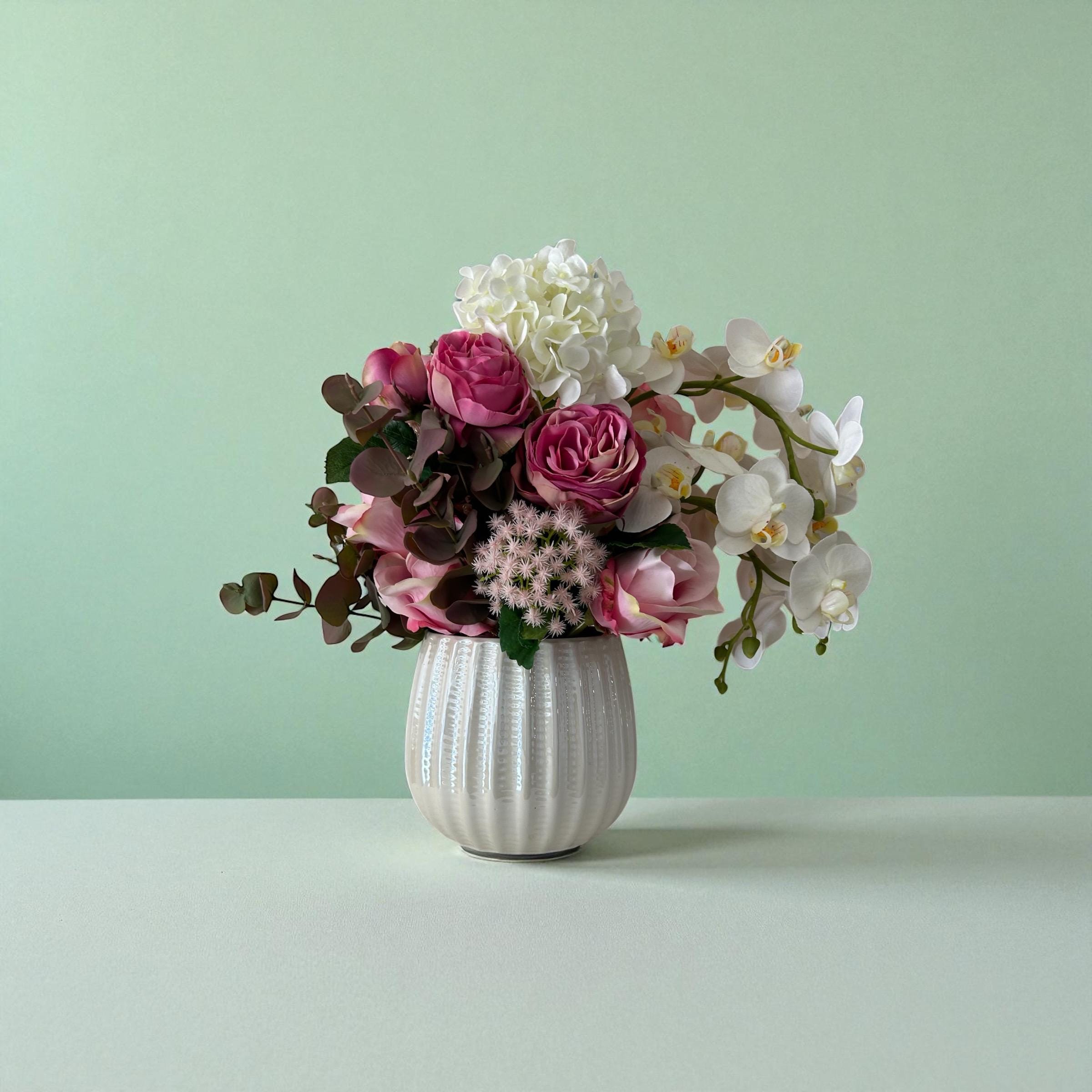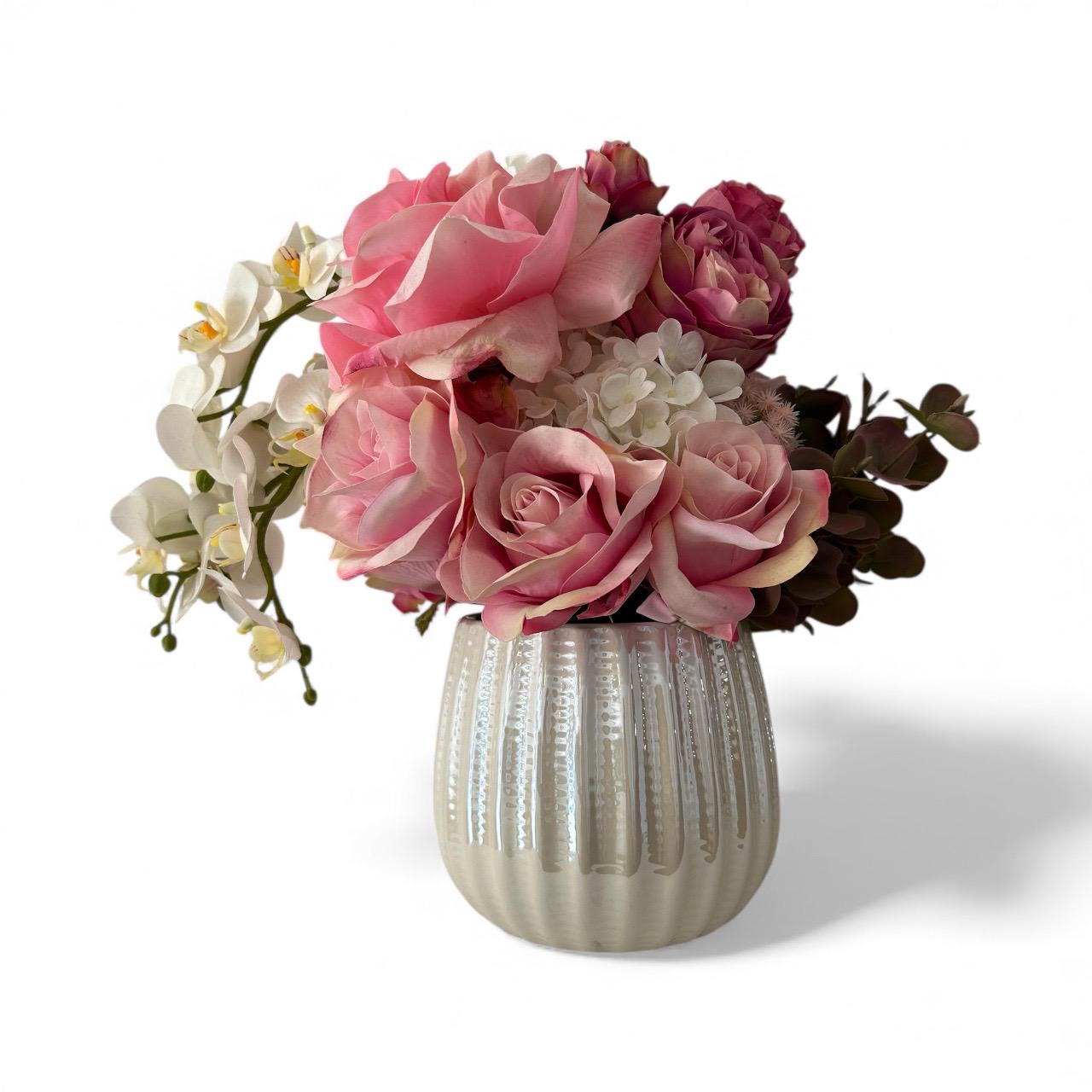 A soft, romantic flower arrangement featuring lush pink roses paired with elegant white orchids, artfully designed in a sleek white ceramic vase. The delicate blend of rosy hues and crisp white blooms creates a graceful, timeless look. The roses add fullness and warmth, while the orchids bring a touch of sophistication with their flowing, sculptural petals. Perfect for expressing love, appreciation, or adding a refined touch to any space.
